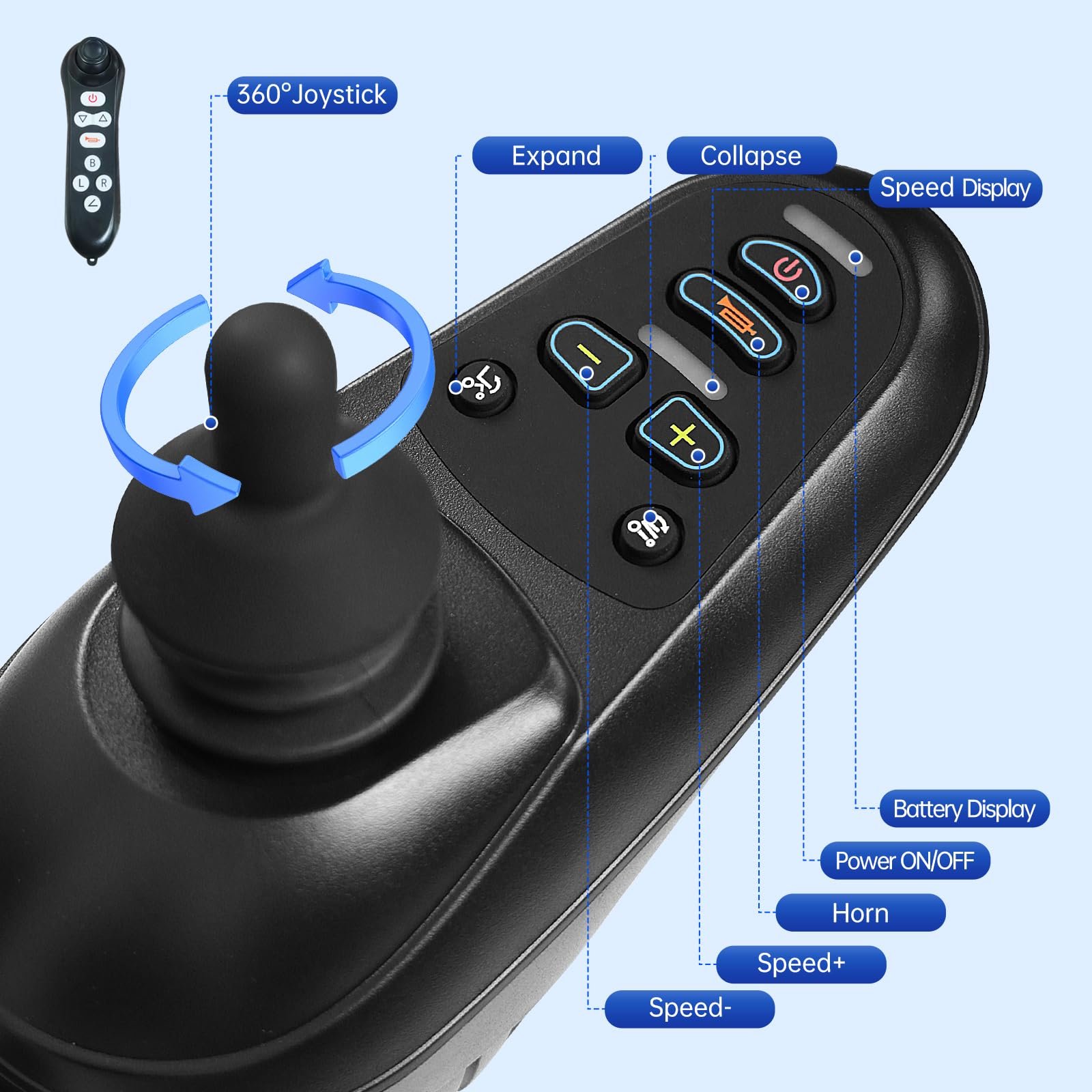 Praktisch im Alltag: Die Auto‑Faltfunktion ermöglicht das automatische Zusammen- und Aufklappen per Tastenkombination am Controller (mit Signalton). Das ist besonders hilfreich für Nutzer, die beim manuellen Falten Unterstützung brauchen oder den Rollstuhl schnell im Auto verstauen möchten. Für sicheres Fahren ist eine elektromagnetische Bremse verbaut, die beim Loslassen des Joysticks automatisch bremst und Zurückrollen an Steigungen reduzieren soll.