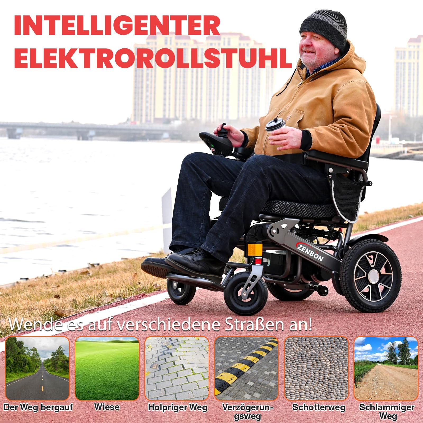 Der ZENBON Elektrorollstuhl ZBLY626 (Silber oder Schwarz) ist ein leistungsstarker, komfortorientierter Elektrorollstuhl für Senioren und Erwachsene. Mit 700W Motor und einer 20Ah Lithiumbatterie bietet er eine Reichweite von bis zu 30 km und fährt bis zu 6 km/h (abhängig von Nutzergewicht, Untergrund, Temperatur und Fahrweise). Er ist für Steigungen bis 12° ausgelegt und eignet sich damit auch für Wege mit leichtem Gefälle oder Anstiegen.