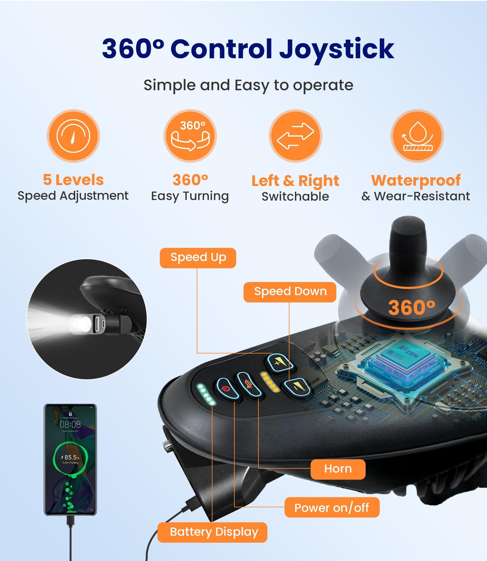Der Doppel‑X‑Rahmen aus 8 mm Karbonstahl ist auf Stabilität ausgelegt und trägt bis zu 150 kg. Für Sicherheit stoppt das elektronische Bremssystem sofort beim Loslassen des Joysticks, ergänzt durch Handbremse, Anti‑Kipp‑Räder, Sicherheitsgurt, Rückfahrwarnung und Hupe. Der Joystick ist beidseitig montierbar, das LED‑Display zeigt den Akkustand, die Geschwindigkeit ist in 5 Stufen einstellbar (max. 6 km/h); zusätzlich gibt es USB‑Ladeanschluss und LED‑Licht für mehr Komfort und Sichtbarkeit.