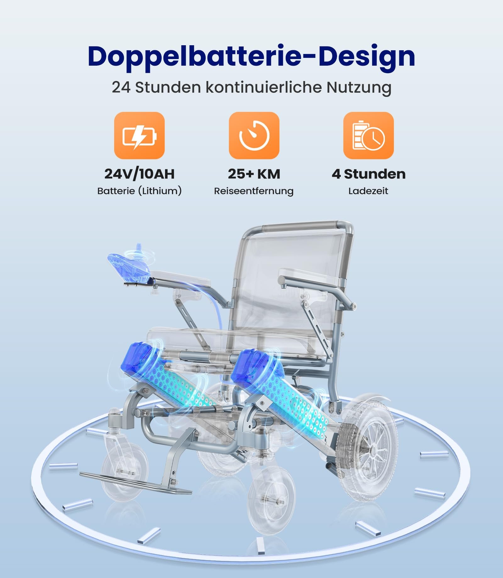 VOCIC V62 Elektrorollstuhl faltbar, Dual‑Akku 2×24V/10Ah, bis 25 km, 500W bürstenlos, 25 kg, Tragkraft bis 136 kg, 3‑Sek.-Faltung, Mondlichtsilber