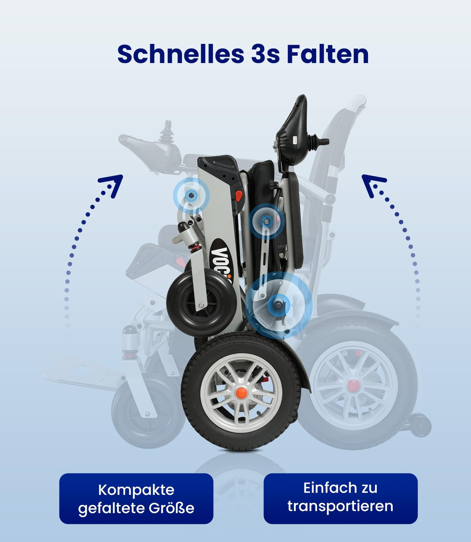 Der VOCIC V62 Elektrorollstuhl in Mondlichtsilber ist ein faltbarer, tragbarer Elektrorollstuhl aus Aluminiumlegierung mit Schnellfalt‑Design (ca. 3 Sekunden) und Gepäckwagen‑Funktion für leichteren Transport. Das Gewicht liegt bei ca. 25 kg (mit 2 Batterien; Bruttogewicht ca. 28 kg), die Faltmaße betragen ca. 66 × 35 × 80 cm.